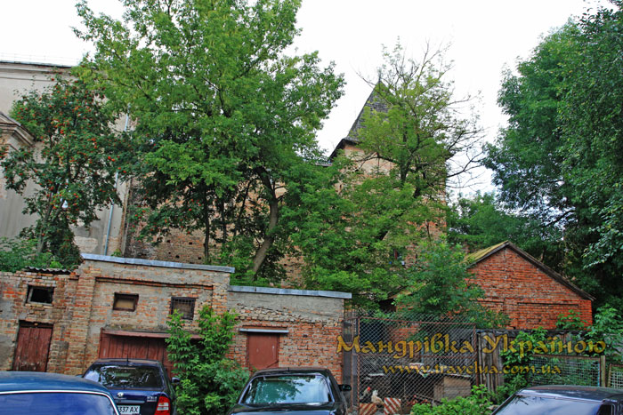 Рухаючись далі вулицею Драгоманова, ліворуч за деревами в дворах можна побачити частково збережені стіни Окольного замку та вежу князів Чарторийських.