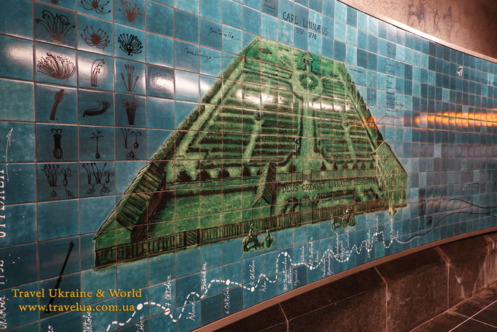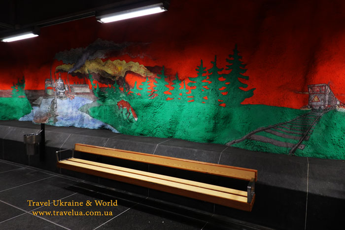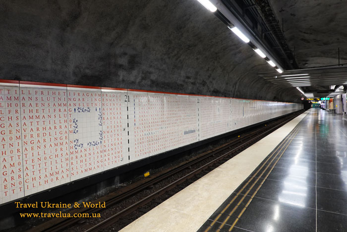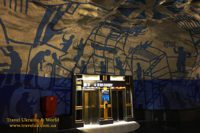 T-Centralen – станція синьої лінії, обслуговується маршрутами T10 і Т11. На станції розпис присвячений будівельникам метрополітену.