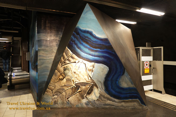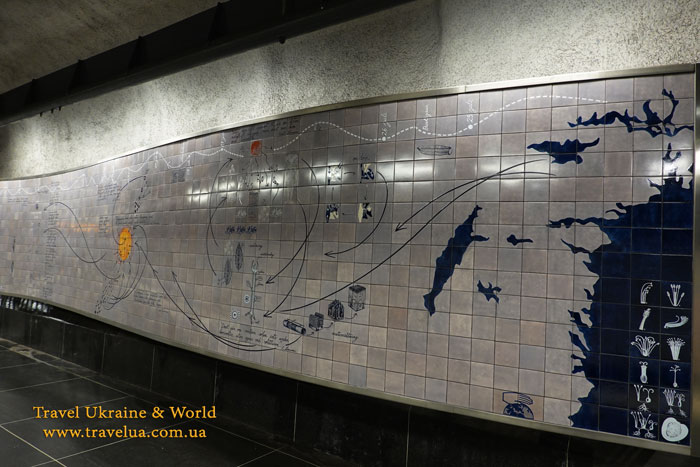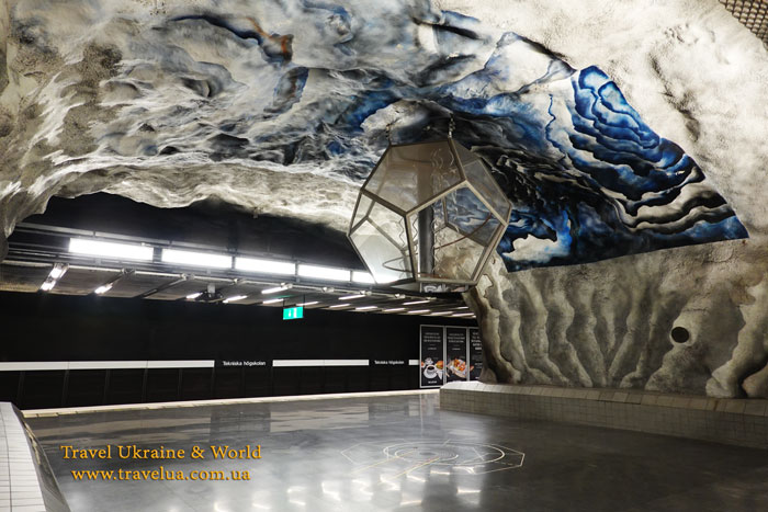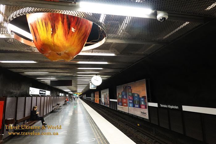 Tekniska högskolan, станція знаходиться недалеко від Королівського технологічного інституту. Художнє оформлення станції метро – закони природи.