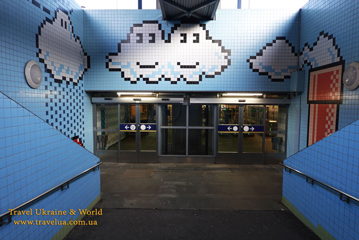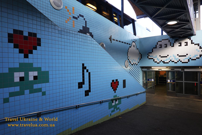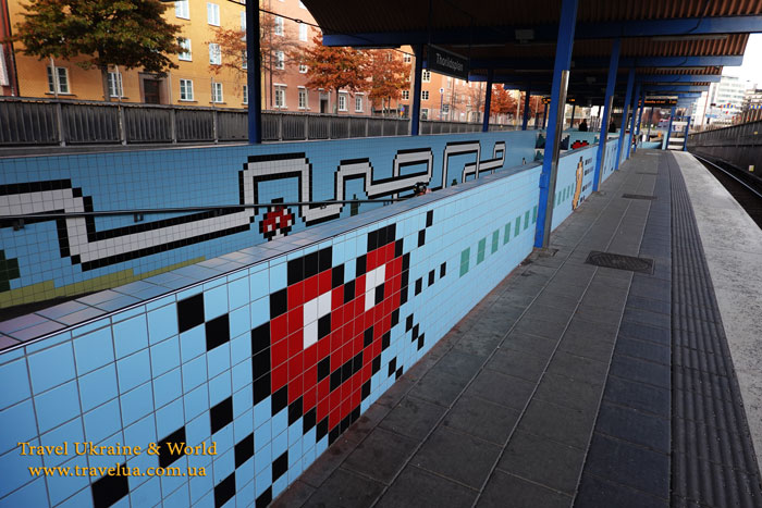 Thorildsplan, станція зеленої лінії T17, T18, T19. Відкрита станція Стокгольмського метро обкладена різнокольоровими плитками, що зображують пікселі, за мотивам відеоігор Pac-Man, Super Mario, Space Invaders.